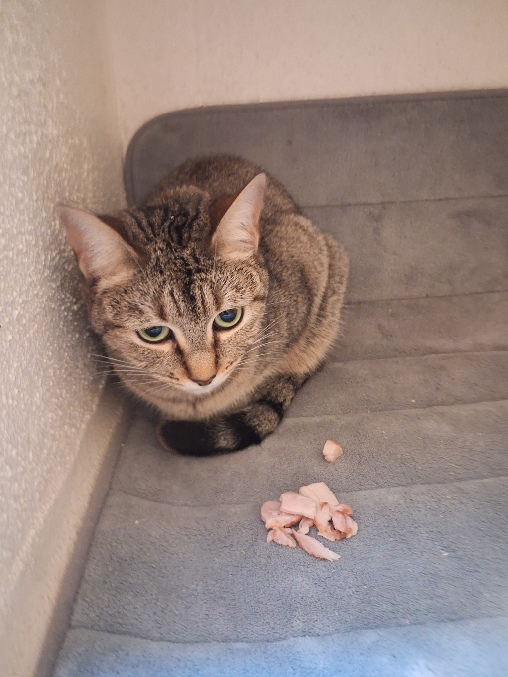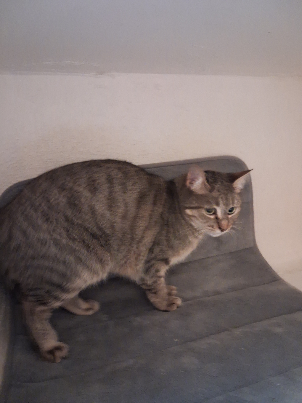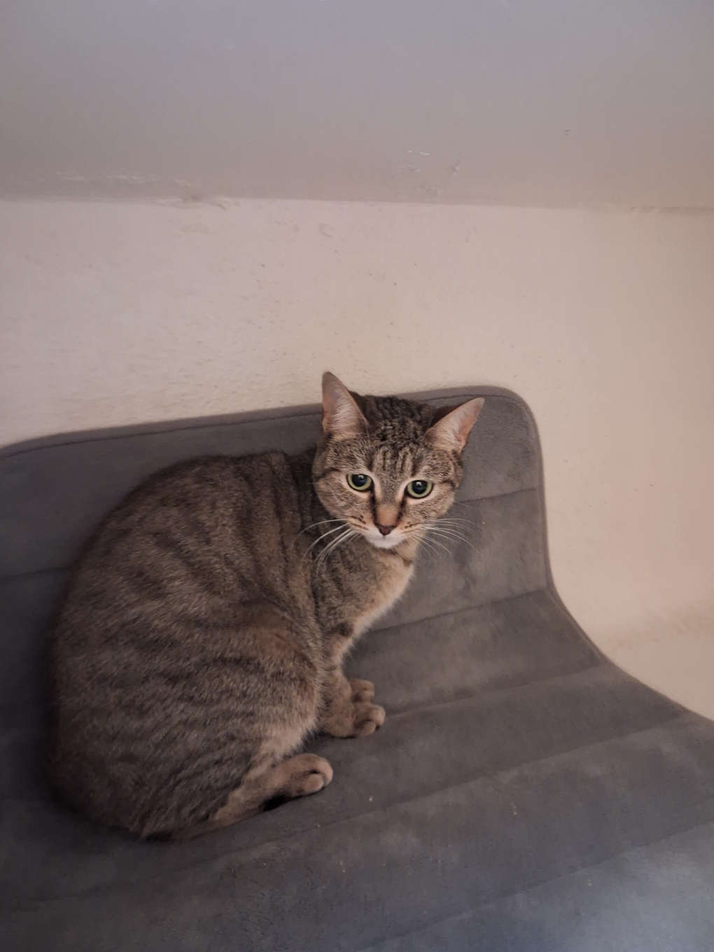 Une maison avec jardin ou un appartement avec terrasse protégée pour une jeune et jolie petite chatte tigrée encore un peu craintive suite à son récent abandon. Elle cherche un foyer calme, des maitres attentifs, aimants et présents.