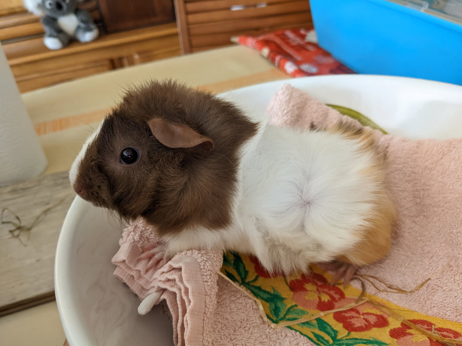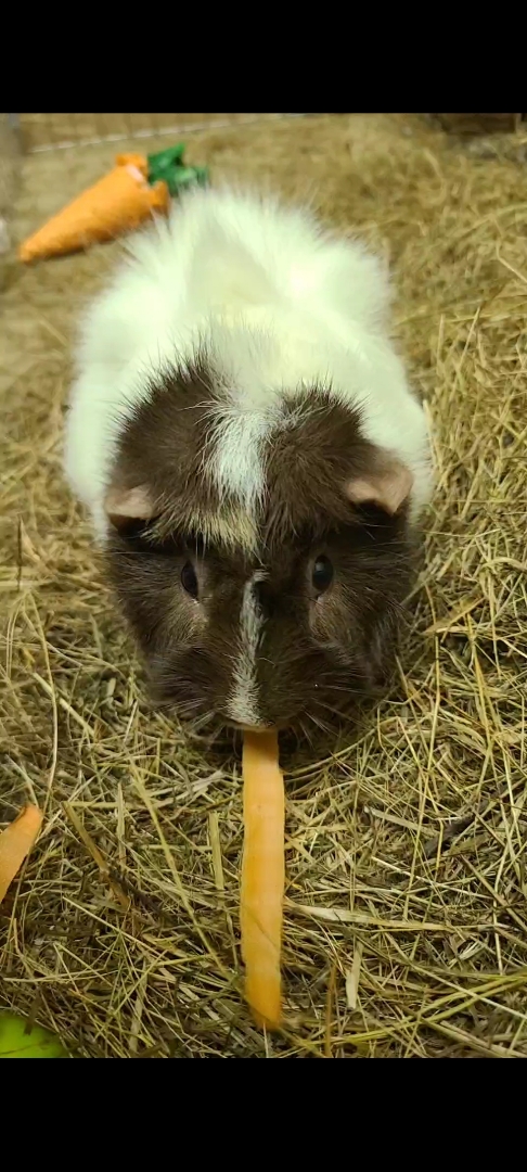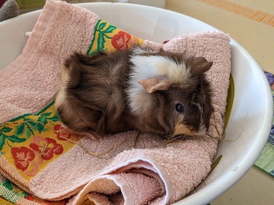 Voici Petite Maman Titine, arrivée au refuge une fin d'après-midi, avec son mâle et leurs trois enfants cochons d'inde.