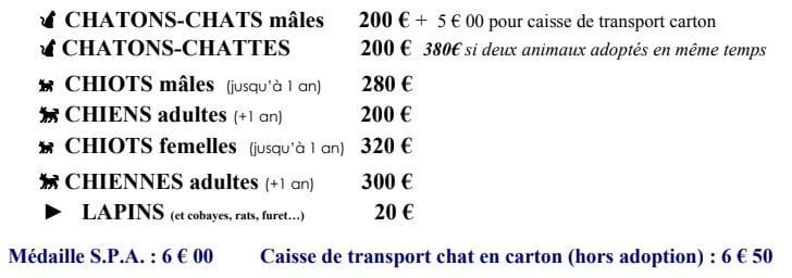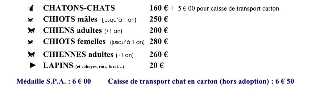 L’adoption d’un animal n’est pas gratuite, elle inclut une participation aux frais vétérinaires (identification, vaccination, stérilisation).
