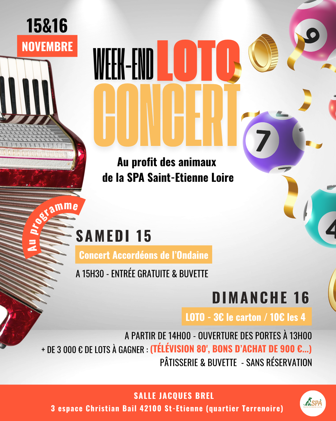 Samedi, profitez du concert des Accordéons de l’Ondaine 🪗 et dimanche, tentez votre chance au grand loto avec plus de 3 000 € de lots à gagner. 🎁🎱